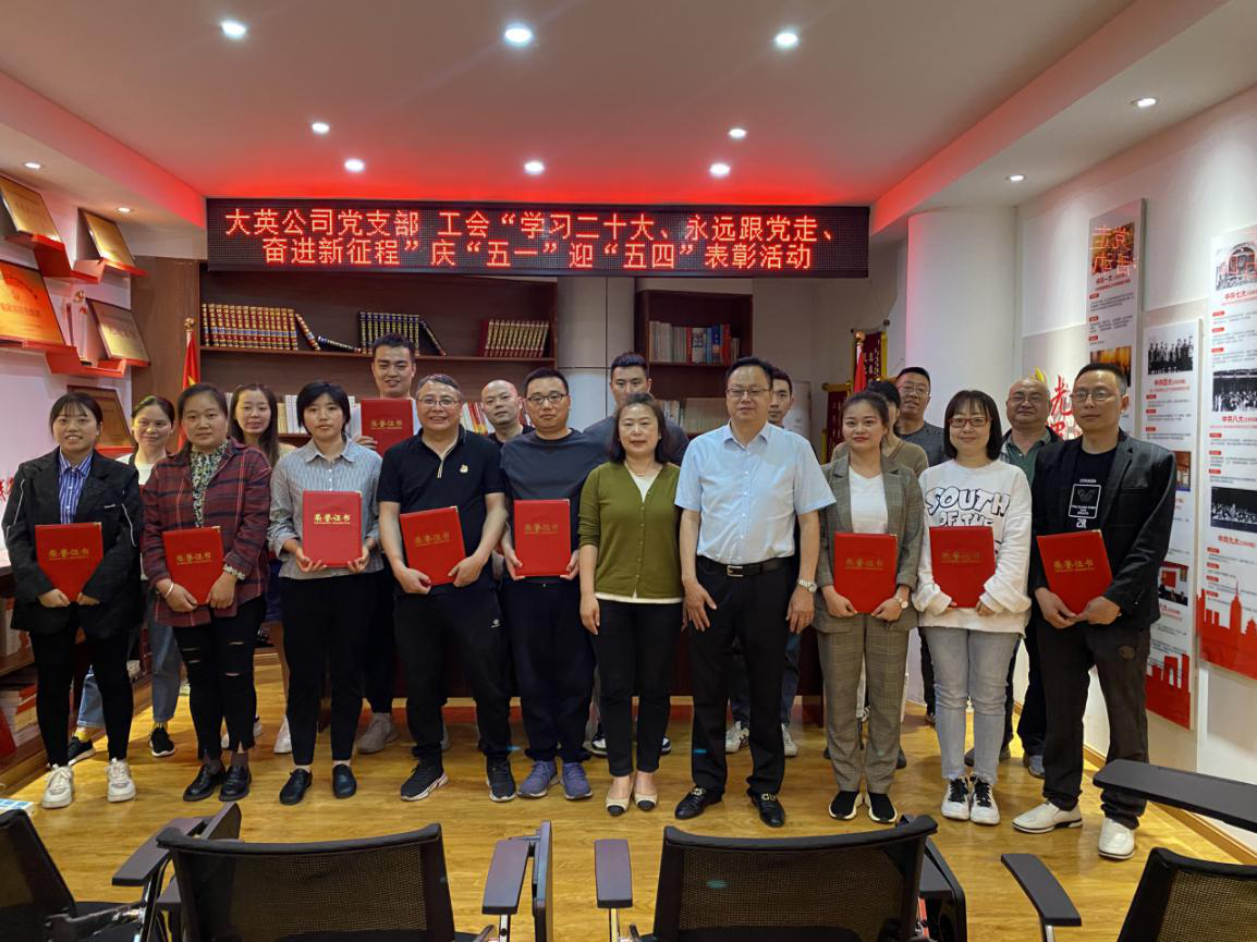 2023年4月27日下午,在“五一”國際勞動節(jié)和“五四”青年節(jié)來臨之際,為全面學習貫徹習近平新時代中國特色社會主義思想,緊緊圍繞學習貫徹黨的二十大精神為主線,大英水司黨支部、工會在五樓黨員活動室召開了“學習二十大、永遠跟黨走、奮進新征程”慶“五一”迎“五四”表彰大會。受大英公司黨支部書記、執(zhí)行董事、總經(jīng)理王文川委托,大英公司副總經(jīng)理、工會主席王洪先主持會議。公司全體黨員、中層干部、職工代表、青年代表、受表彰先進個人參加會議。