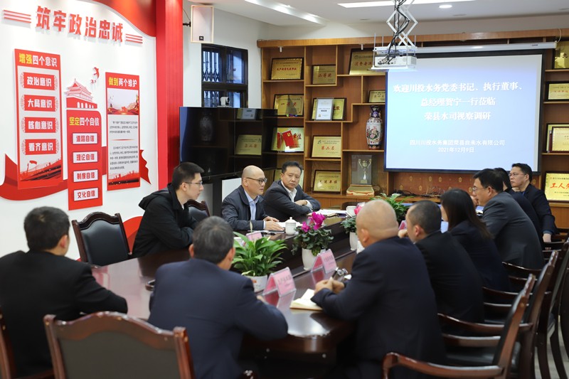 2021年12月9日上午,川投水務(wù)黨委書記、執(zhí)行董事、總經(jīng)理賀寧,副總經(jīng)理、射洪水司董事長(zhǎng)、總經(jīng)理劉松果,辦公室主任嚴(yán)斯亮赴榮縣水司開展視察調(diào)研工作。榮縣水司支部書記、執(zhí)行董事、總經(jīng)理龔慶等陪同視察調(diào)研。
